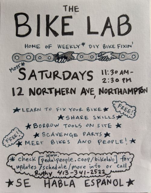 The next Bike Lab will be Saturday Jan 24th, 2026 and then February 7th, from 11:30 am to 2:30 pm at 12 Northern Ave in Northampton. Between February 20th to March 20th, Ruthy will be holding Bike Lab in Trinidad! Other folks will keep it running here in Northampton (dates TBD, check out our website for current info).