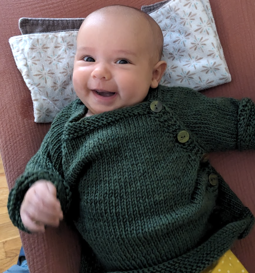 We also learnt of lots of local resources to tap into if you’re ever looking to offload old baby stuff or acquire used baby goods in Western Mass: | | | | Oli sporting a lovely sweater knitted by Robbin; a very talented PP customer :) | | | |